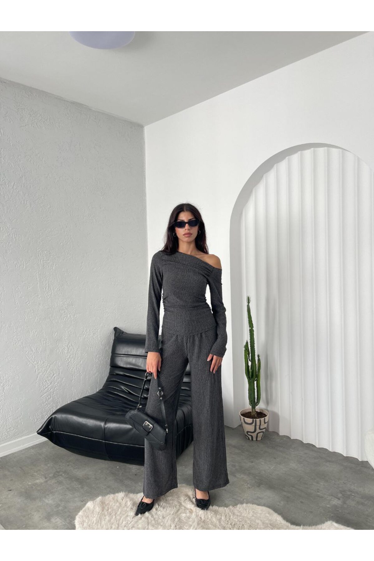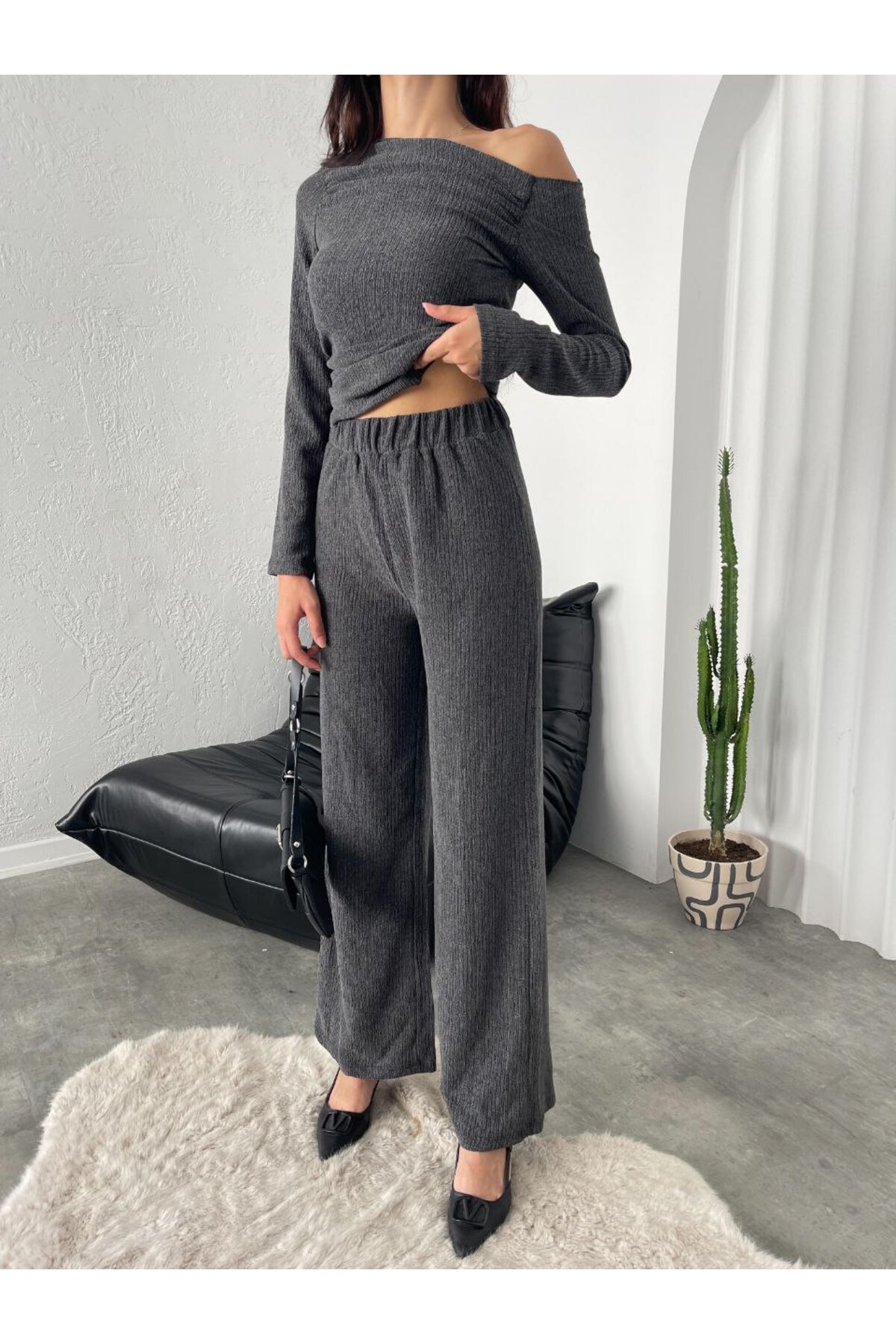 Kadın Antrasit Yarım Boğazlı Parmak Geçmeli Triko Alt Üst Takım