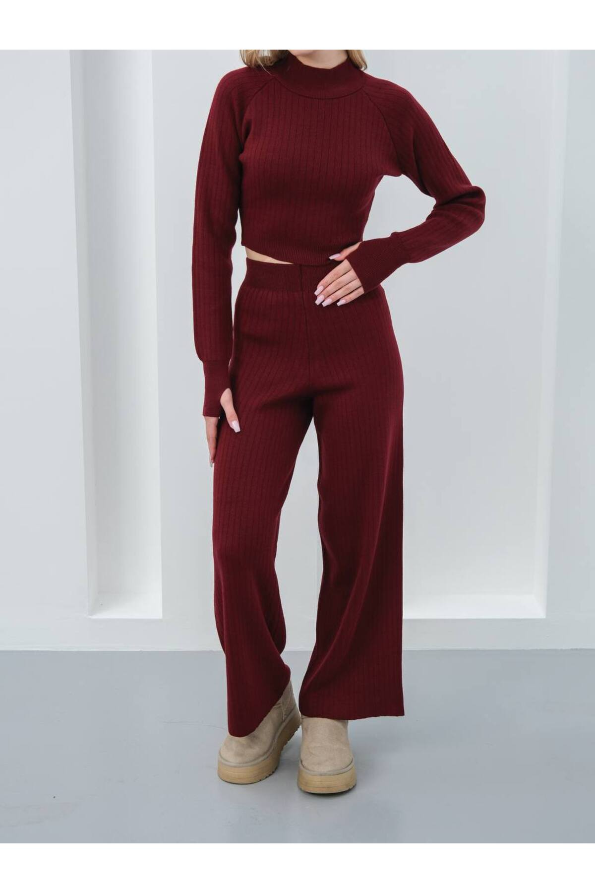 - Standart kol tasarımı ile günlük kullanım için ideal konfor sunar.; - Uzun kollu yapısı, mevsim geçişlerinde sıcak tutarken şıklığınızdan ödün vermezsiniz.; - Orta kalınlıkta akrilik materyali sayesinde hem rahatlık hem de dayanıklılık sağlar.; - Yarım balıkçı yaka detayı ile modern ve zarif bir görünüm kazandırır.; - Casual ortamlarda rahatlıkla tercih edebileceğiniz günlük giyim tarzına uygunluk gösterir.; - Yüksek bel kesimi sayesinde vücut hatlarınıza mükemmel uyum sağlayarak feminen bir siluet oluşturur.; - İki parçadan oluşan set; alt ve üst kombinasyonuyla pratik ve stil sahibi bir seçenek sunar.; - Sürdürülebilirlik detayının bulunmaması, çevre dostu alternatifler arayanlar için dikkate alınması gereken bir noktadır.; - Basic siluetiyle her türden ayakkabı ve aksesuarla kolayca kombinlenebilir; zamansız parçalar arasında yerini alır.; - Geniş paça tasarımının sunduğu hareket özgürlüğü gün boyu konforlu hissetmenizi sağlar.; - Astarsız yapısıyla hafiflik katarken cepsiz oluşu minimalist yaklaşımı benimseyenler için idealdir.; - Yıkama talimatlarının netleştirilmesi kullanıcıların ürün ömrünü uzatmasına yardımcı olacak şekilde tasarlanmıştır.; - Düz deseniyle sadelikten yana olanların beğenisine hitap ederken slim kalıp vücudu sararak fit görünüm kazandırır.; - Orta ve genç yaş grubuna yönelik olarak üretilmiş olup genç ruhunu yansıtan dinamik tasarımlara sahiptir.; - Triko kumaşı yumuşak dokusuyla teninizde nazikçe hissedilirken crop boy kesimiyle trendleri takip etmenize olanak tanır.; - Türkiye menşeli olması yerli üretim tercih edenler için gururla sunulmaktadır.;